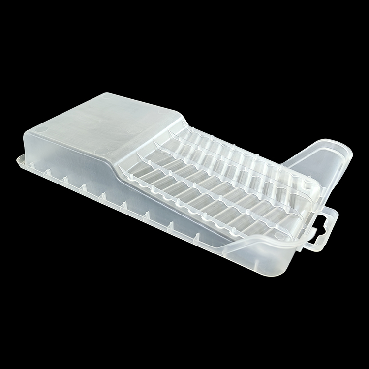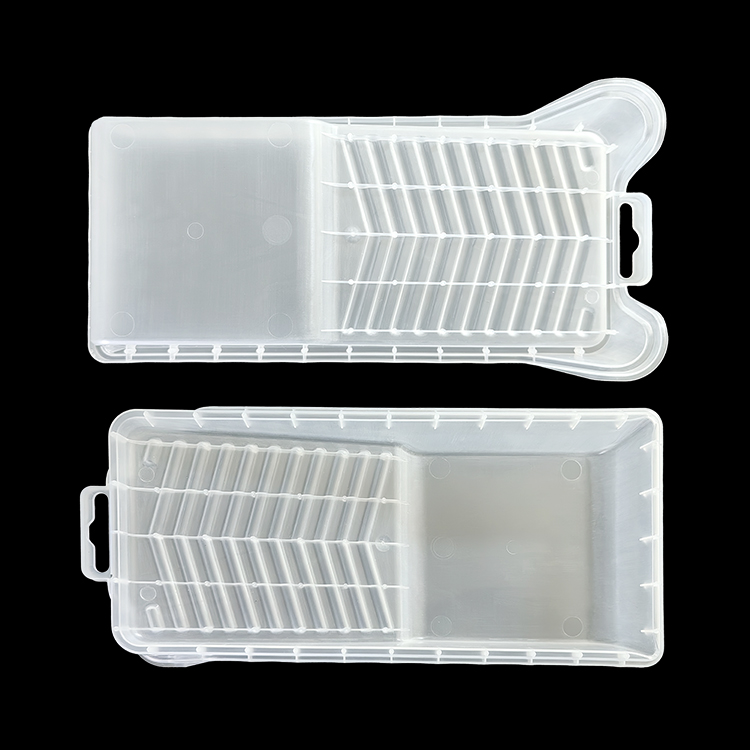 Design: Ineinandergreifender Deckel + Boden mit luftdichtem (oder halbluftdichtem) Verschluss; Interne Rippen-/Hohlraumstrukturen zur Sicherung kleiner Verbrauchsmaterialien (Spritzen, Nahtnadeln, Katheter oder Instrumentenspitzen).